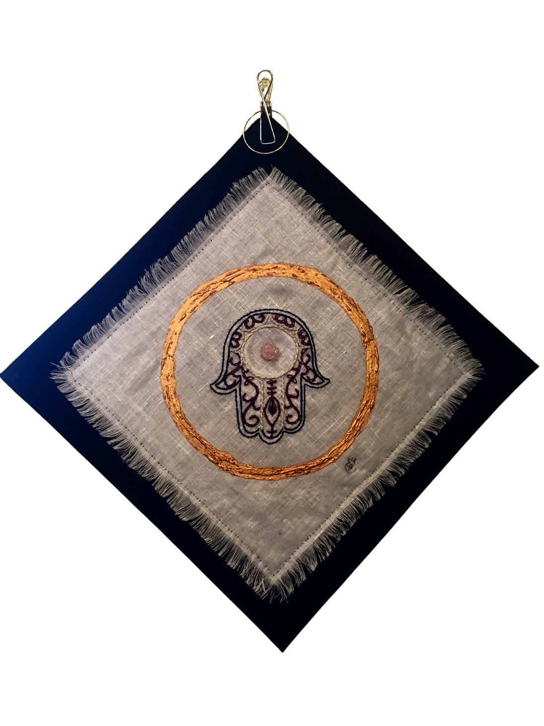 Materials: Cotton embroidery on linen, with acrylic paint and rose quartz, set on wool felt.